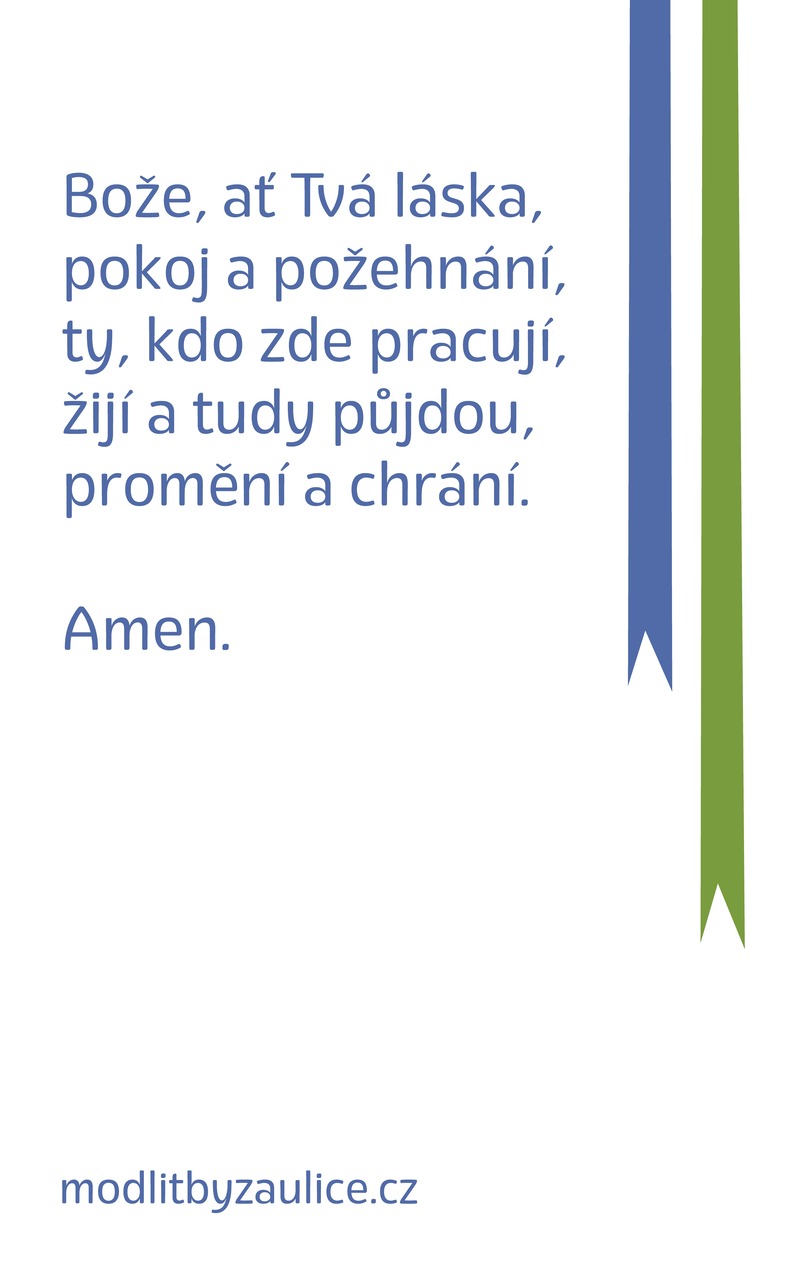 Pokud místo či ulici neznáš, zjistit si, kde je. Způsob modlitby je plně na tobě. Pokud bys nevěděl, jak na to, jako inspirace ti může posloužit druhá strana kartičky, na které je společná modlitba. Tip od nás je si na místo zajít a zjistit, co v dané ulici vlastně všechno je a kdo tu žije.